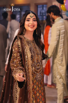 Embrace the warmth of autumn in this festive earth-toned creation. The embroidered shirt unfurls like a weathered landscape, its intricate design a tapestry woven from threads of desert gold. Gold zari shimmers like sunlight dancing on windswept dunes, while scattered 5mm gold sequins, like desert wildflowers peeking through parched earth, add a touch of unexpected beauty. Paired with an airy dupatta, a wisp of desert air, this ensemble isn't just celebratory attire, it's a captivating melody sung by the earth itself.
