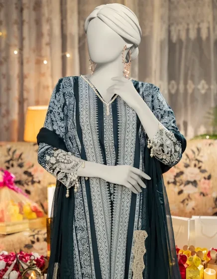Collection: Embroidered Paste Printed Cotton Silk Shirt, Dyed Maple Silk Trouser, Dyed Chiffon Dupatta