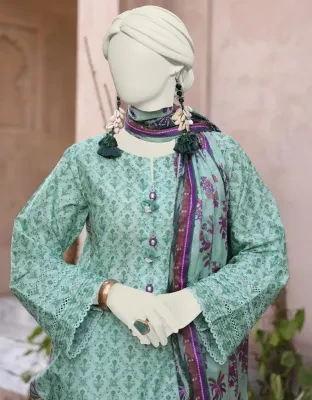 • Junaid Jamshed Women Unstitched 3 Piece for Women And Girls - Fabric: Lawn - Color: Green -Collection: Eid Tehwar Edit Vol. - Design code: Jlawn-S-24-528 Bahar