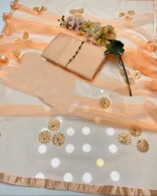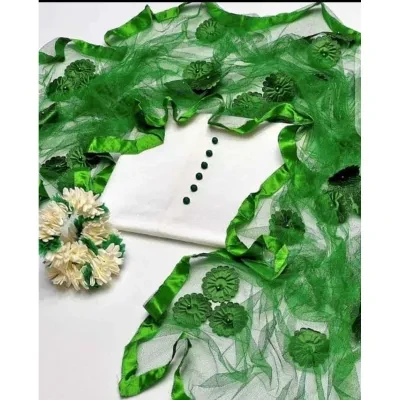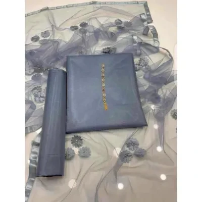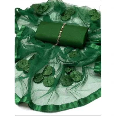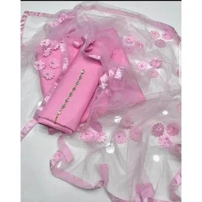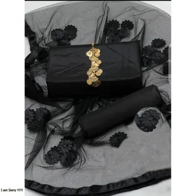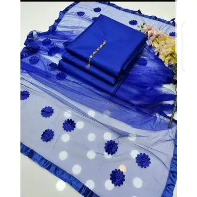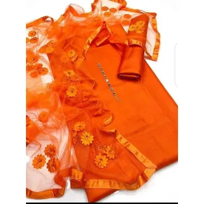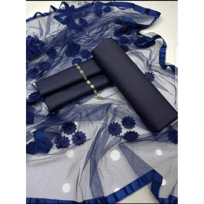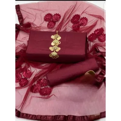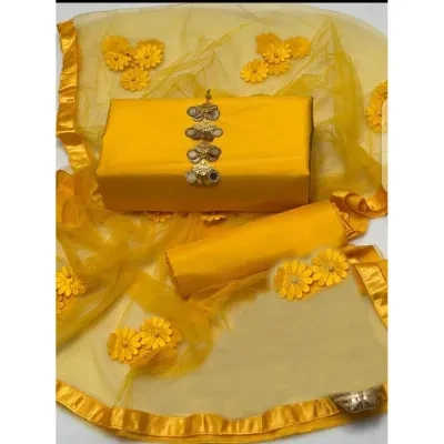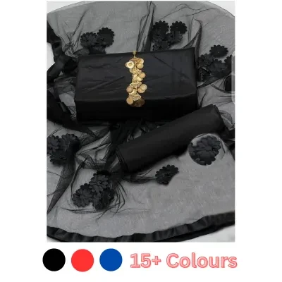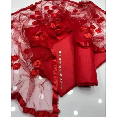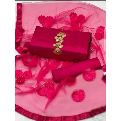 Libaas Hub 3 Piece Unstitched Katan Silk Plain Shirt & Trouser With Net Duppatta Suit For Womens & Girls || Available In 15+ Colors