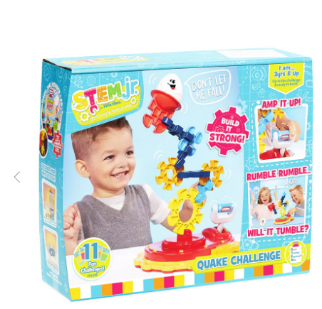 Rumble, rumble... will it tumble? Ignite your child's curiosity through hands-on play with the STEM Jr. Quake Challenge! Build the tower strong, amp up the shaking, but don't let the egg fall! Introduce your child to engineering in a fun, hands-on way! With 11 challenge cards and different structures to build, the possibilities are endless. For one or two players.