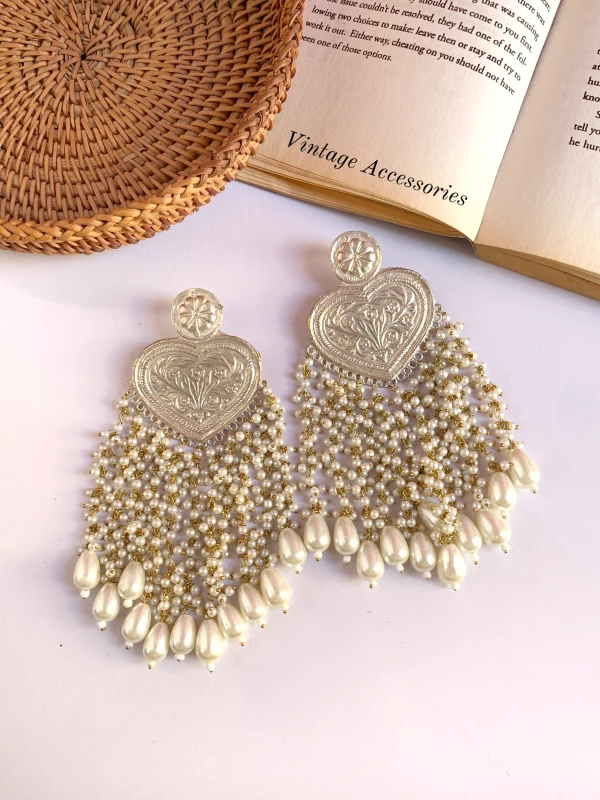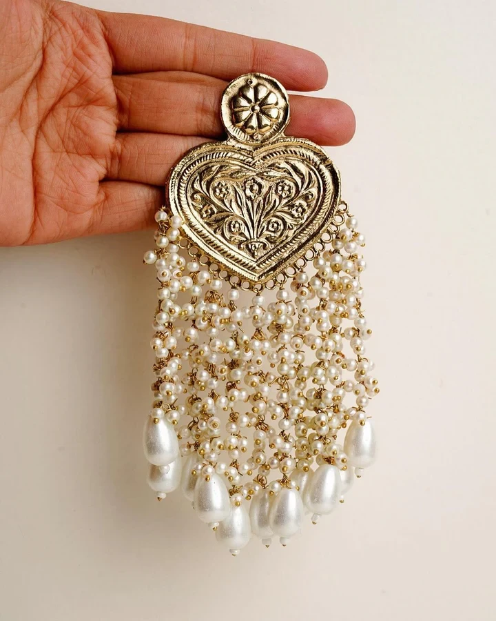 Long Pearl Golden Stylish Ear Rings for Girls These gorgeous Long Pearl Golden Stylish Ear Rings for Girls are a masterpiece of Kuchi craftsmanship. The beautiful Afghani earrings are made of high-quality gilded metal alloy. The heart-shaped earrings are adorned with attractive designs and decked with stunning pearls and beads attached with expertly made delicate metal alloy chain links. This beautiful pair can complement any dress that you choose for the festive event.
