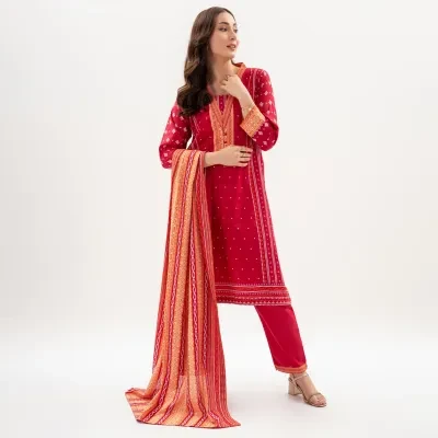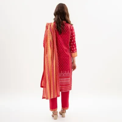 The three-piece set includes an unstitched kameez (shirt), a shalwar (pants), and a dupatta, allowing you to customize the fit and design to suit your individual taste. Embrace the joy of personalization and create a one-of-a-kind outfit that reflects your personality.