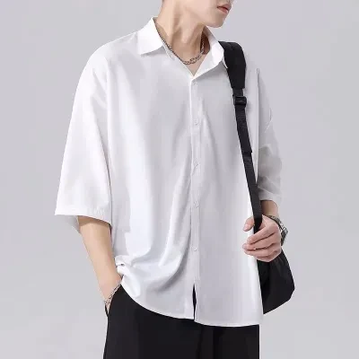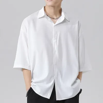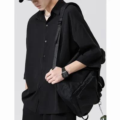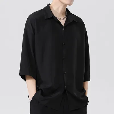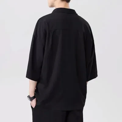 men's thin black ice silk shirt loose casual polo collar