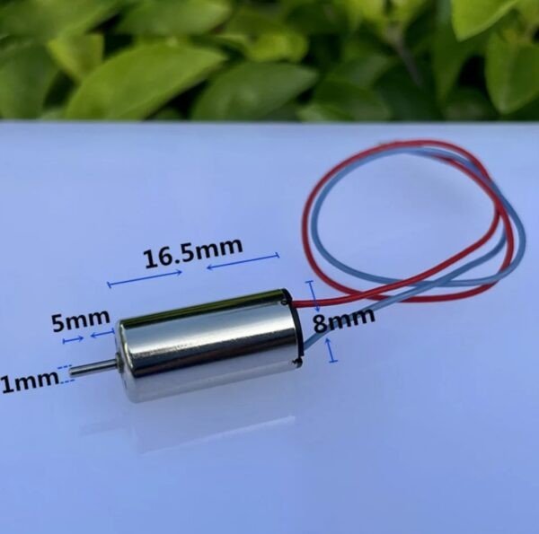 • Mini Coreless Motor for Drones and QuadcoptersReverse Polarity will change direction of Rotation CW and CCWSpeed: 48000 RPM at 3.7VVoltage Ratings: 3.7 to 4.2VWeight: 4gLength: 16.5mmDiameter: 8mmShaft Length: 5mmShaft diameter 1mmWires colour: Red and BlackHigh Quality High Speed Motor