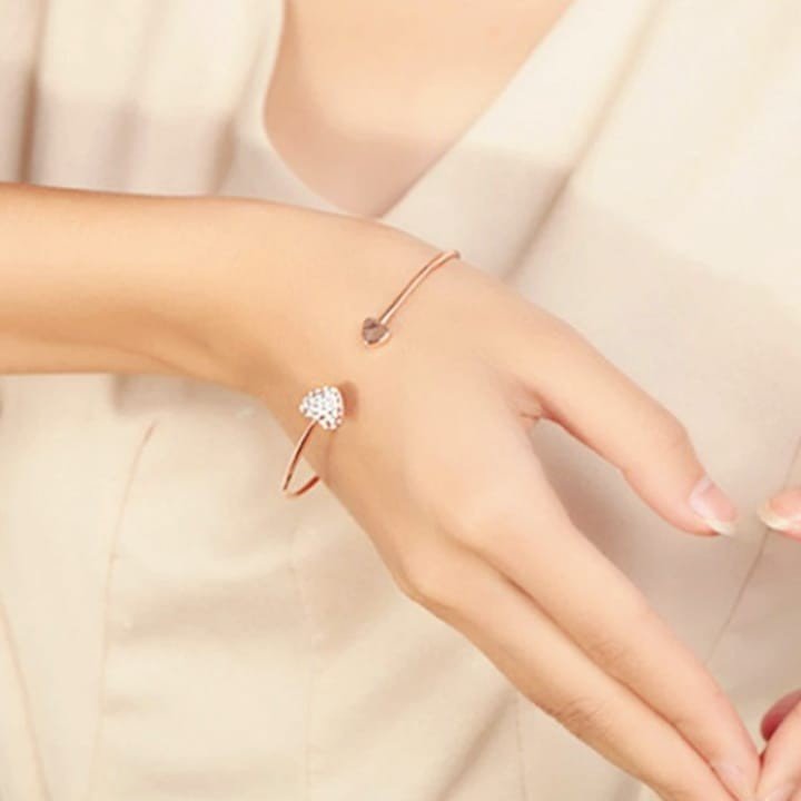 Open Cuff Bangle in Golden Color with Heart Shape Crystal Studs. Discover a perfect blend of elegance and charm with this open cuff bangle. The golden color exudes luxury, while the heart-shaped crystal studs add a touch of romance and sparkle. The open design ensures a comfortable fit for most wrists. Elevate your style with this exquisite bangle, adorned with heart shape crystal studs, and make a statement that captures both grace and glamour."