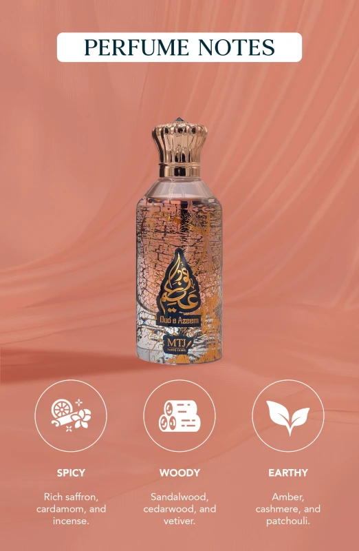 Welcome to the world of MTJ Fragrances, where every scent is a story waiting to be told and every fragrance is a journey of sensory delight. With a rich heritage in crafting exceptional perfumes, MTJ Fragrances is a name synonymous with elegance, luxury, and the art of olfactory expression. MTJ Oud E Azeem, tells the story of the brave and audacious legacy of a royal king. A woody oriental fragrance that evokes the stable, powerful nature of an established and flourishing kingdom. Intense smoky incense and its smoldering grip on sharp saffron and cardamom adds new dimensions - evoking a powerful aura. The Cypriot is unleashed - enhancing the exotic woodiness of sandalwood while imbuing it with vetiver undertones - for an unforgettable silage. Rich patchouli finally dominates the scene, while ambery cashmere provides a sense of success and victory.
