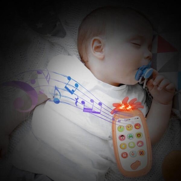 Pineapple shaped phone with flashing LED functions, soft teether on the top. Educate and entertain your child, teach English quickly. Compact size is designed for easy travel, car rides, airplane trips, and more. Touch letters to learn sound effects, test visual memory skills, build English comprehension and learning abilities. Plastic Material and non toxic paint. Lightweight, Bilingual. 3 x AAA Batteries (Not Included)