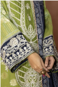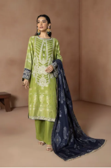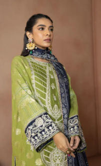 Etched with finest embroidery, this green hued jacquard three-piece ensemble features blue dupatta.Product Detail