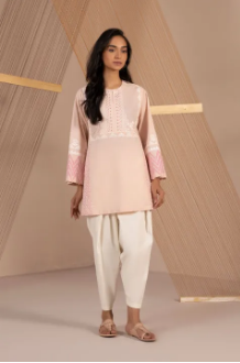 Strut in style responsibly with this peach hued A-line silhouette featuring embroidered front and block printing.