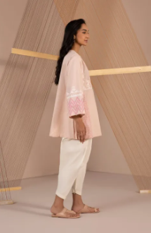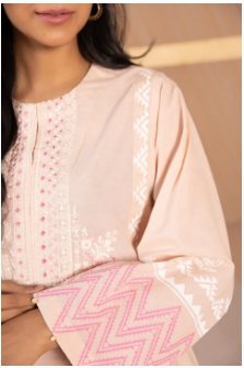 Strut in style responsibly with this peach hued A-line silhouette featuring embroidered front and block printing.Details: