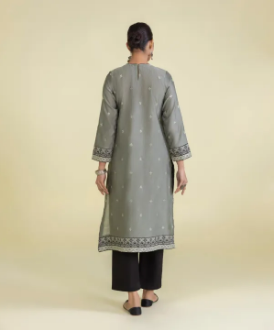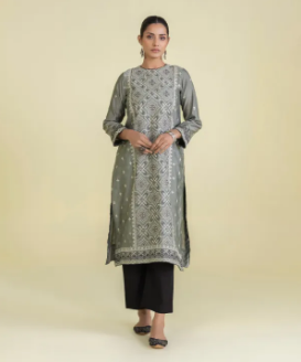 Adorn grace with this grey A-line silhouette featuring intricate embroidery patterns curated in silk cotton net.