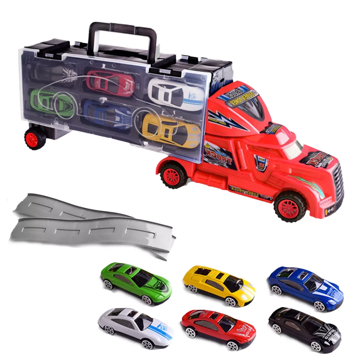 Transport Truck Container with 6 PullBack Cars Toys Set For Kids and Boys