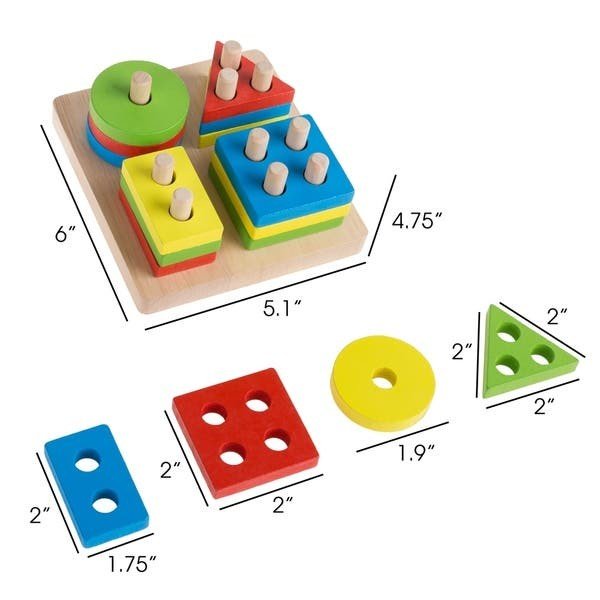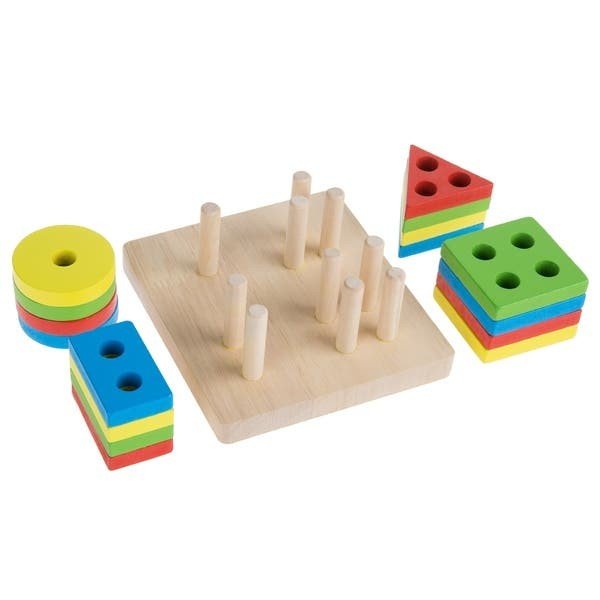 Geometric Sorting Board consists of a set of five colorful basic shapes which can be stacked together on the sturdy wooden board.